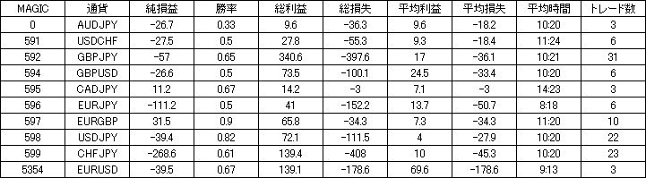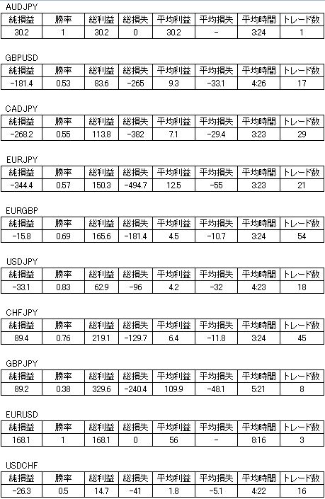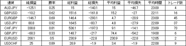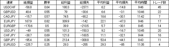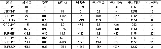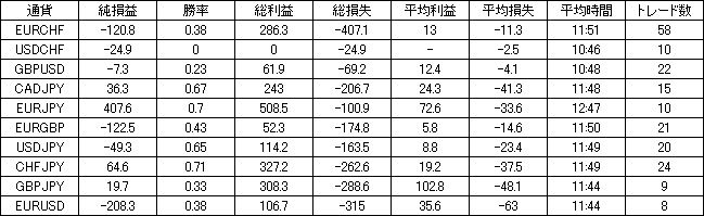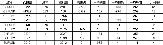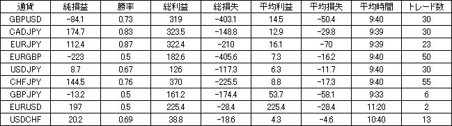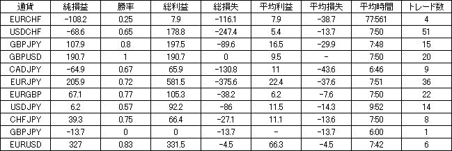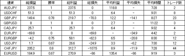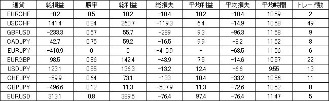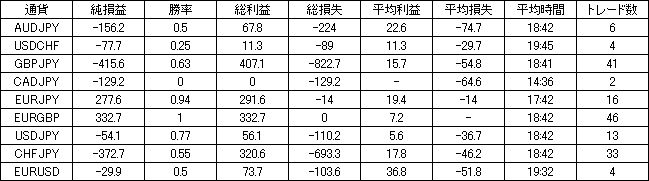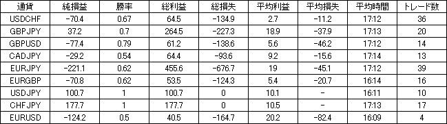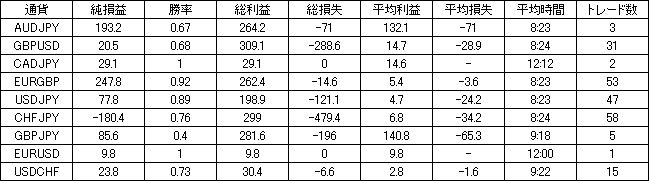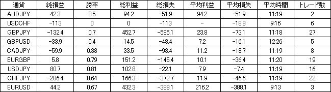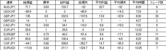 | 通貨 | 純損益 | 勝率 | 総利益 | 総損失 | 平均利益 | 平均損失 | 平均時間 | トレード数 |