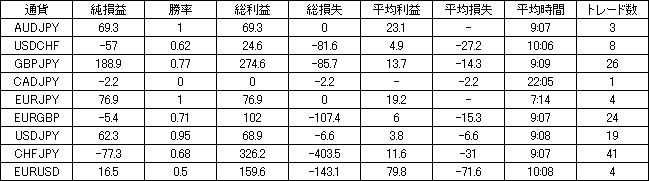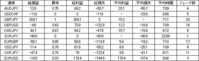 | 通貨 | 純損益 | 勝率 | 総利益 | 総損失 | 平均利益 | 平均損失 | 平均時間 | トレード数 |