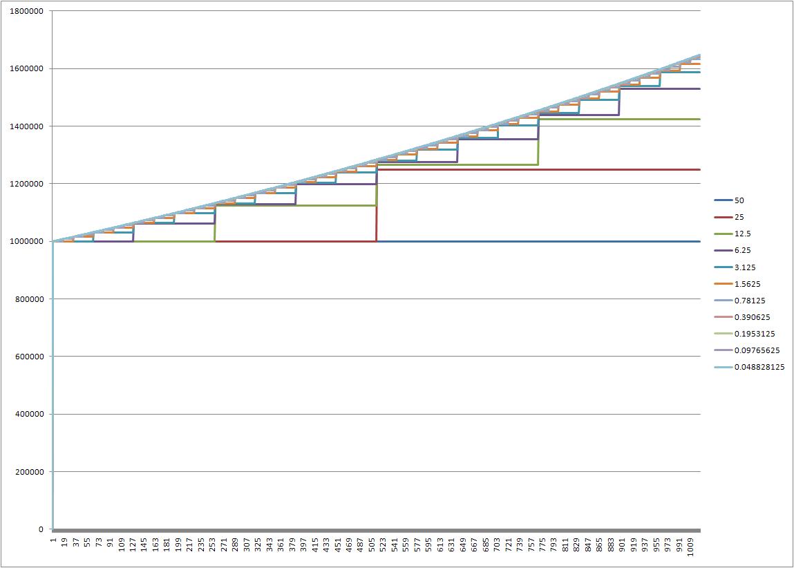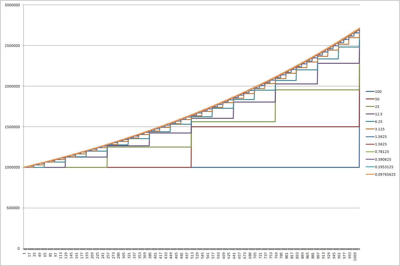 上図は、その2分の1していくにつれて、資産曲線が滑らかになり、かつ、271万円に近付いていく様子を